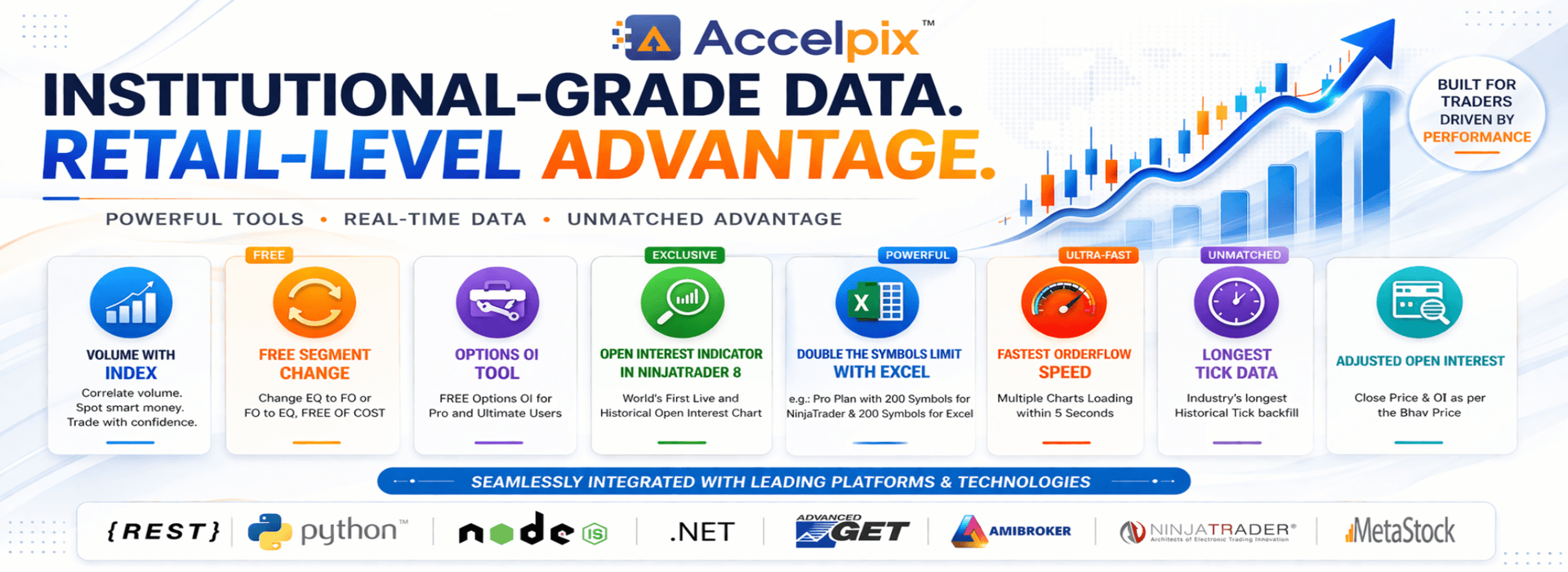 At Accelpix, we combine speed, accuracy, and innovation to deliver real-time stock market data and custom software solutions for traders, investors, and businesses. From Amibroker, NinjaTrader 8, and MetaStock integration to live & historical stock market data APIs, we provide unmatched technology support to power your trading journey.